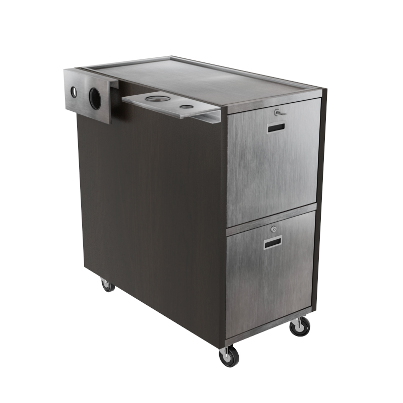 The epitome of beauty, portability, and storage. This single-sided trolley is on casters and features two locking drawers, stylist tray on top and a folding tool holder. Create a unique look with a custom finish. Complete the look – pair with the Pittsburgh Styling Station.