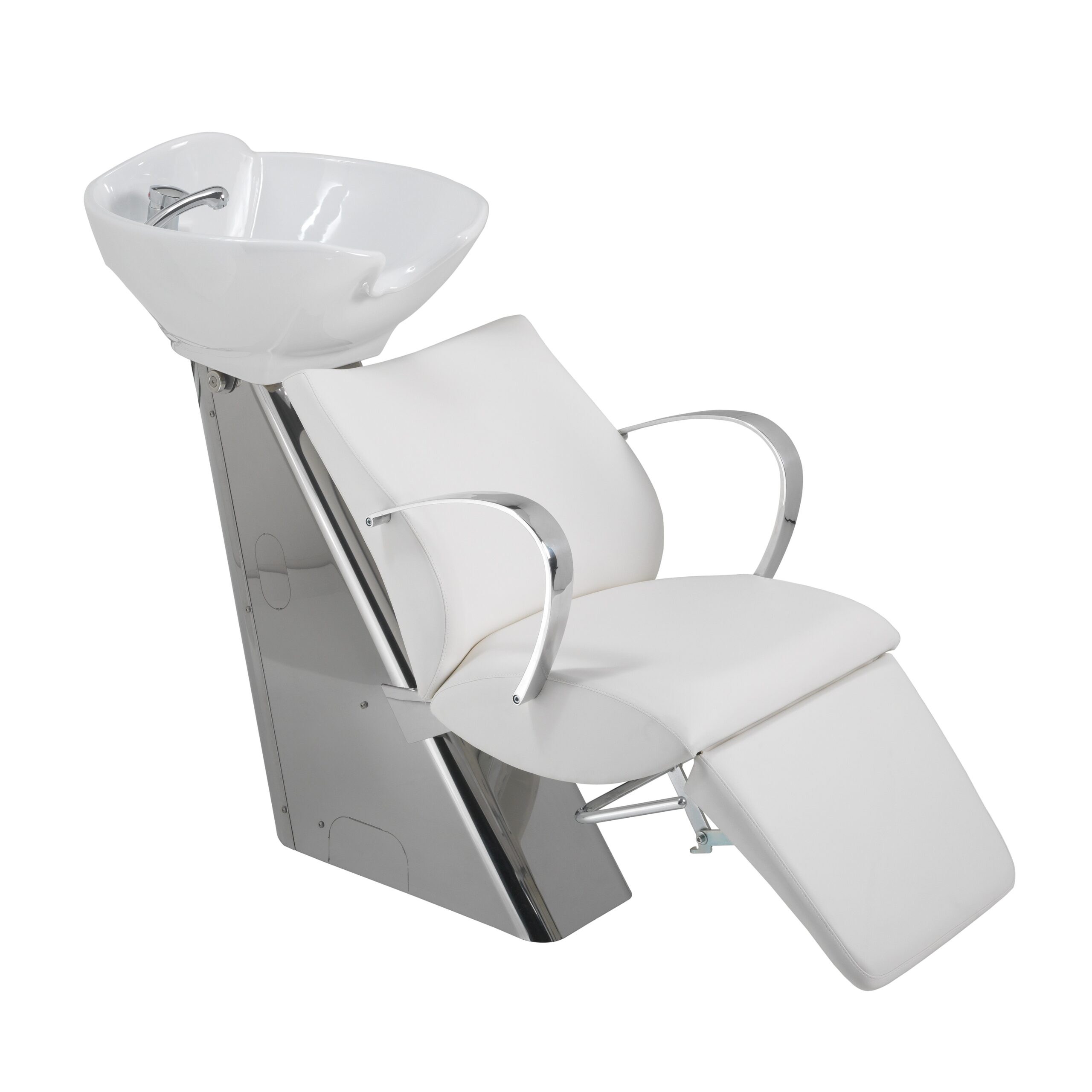 Shampoo Unit with vinyl covered seat, polished aluminum armrests, stainless steel structure, tilting basin made of white ceramic. The stainless steel base and shiny chrome arms are easy to keep clean and made to last. The large tilting ceramic bowl and extendable foot rest add to the all over comfort of the chair. Ergonomically designed for good lumbar support. Three grades of vinyl colors available. Optional vacuum breaker. Optional All-In-One fixture #800.